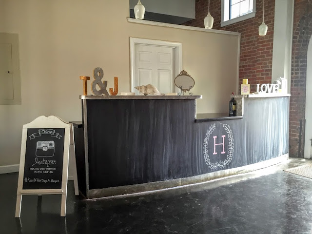 The chalkboard bar was customized for The Hayes' and decorated with shells, sparkling initials, a signature drink display and a board illustrating their Instagram hashtag.